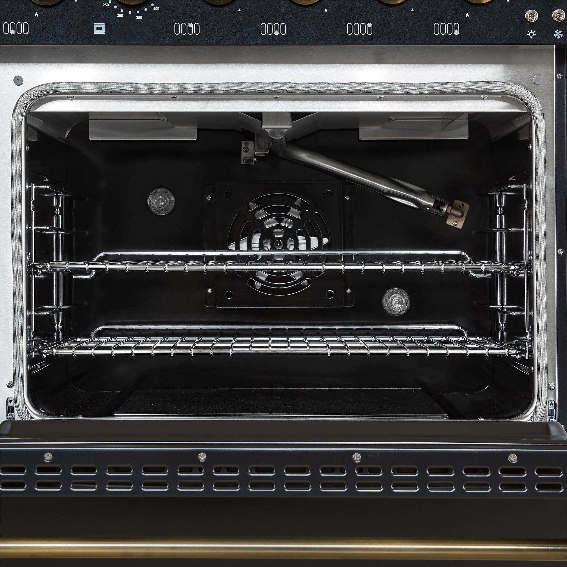 Elevate your kitchen with the stylish and high-performance Forno Antico 48" Gas Range in black, designed to bring elegance, functionality and affordability to your home. With 8 sealed burners and a total output of 94,000 BTU, it delivers the power and precision needed for any culinary challenge. The two dual-ring brass burners offer up to 20,000 BTU for high-heat searing and 1,000 BTU for simmering, providing exceptional control. Its 3.5 cu. ft. convection oven, along with an additional 2 cu. ft. oven, provides ample room for big family meals. With its elegant black finish and antique brass accents, the Antico exudes sophistication, while the cast-iron grates provide lasting stability and durability. The recessed enamel cooktop makes cleanup a breeze, combining style with practicality. Whether you're preparing a weeknight dinner or hosting a dinner party, the Antico offers the versatility and power to handle it all, while enhancing the beauty of your kitchen.