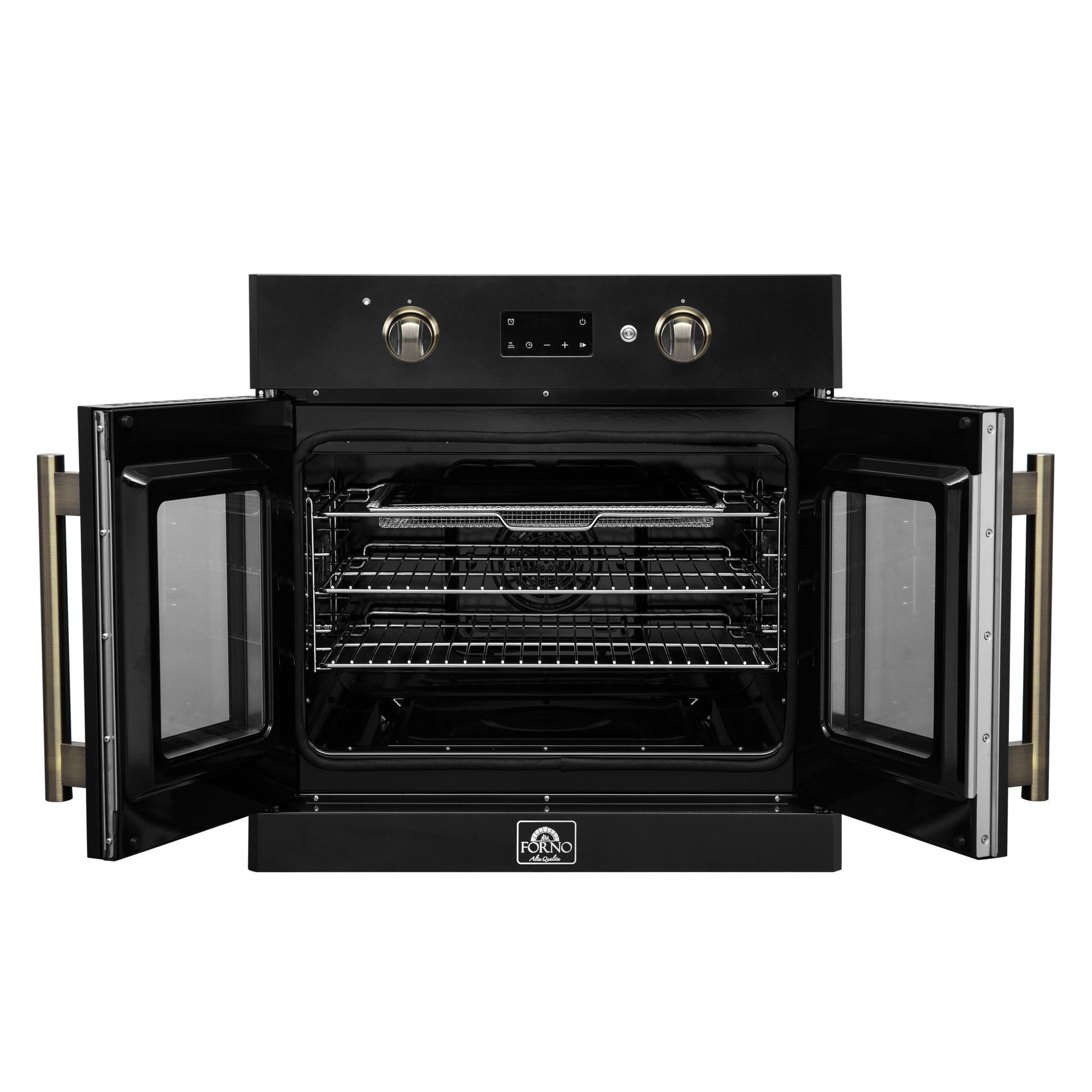 Timeless elegance meets exceptional performance with the Forno Asti 30” French Door Wall Oven in black with antique brass accents. The 3.68 cu. ft. true convection oven guarantees a perfectly even cooking temperature, and the French door allows for easy one-handed access. Cook healthier meals with the integrated air-frying function, delivering a crispy meal with very little oil. Precision knobs ensure an optimum selection of functions and temperatures, while LED digital displays make it easy to adjust the timer and sous-vide mode. The black enamel interior resists stains, and the self-cleaning mode eliminates the inconvenience of manual cleaning. Created for those who appreciate a blend of sophistication and performance, this oven transforms any kitchen at an affordable price.