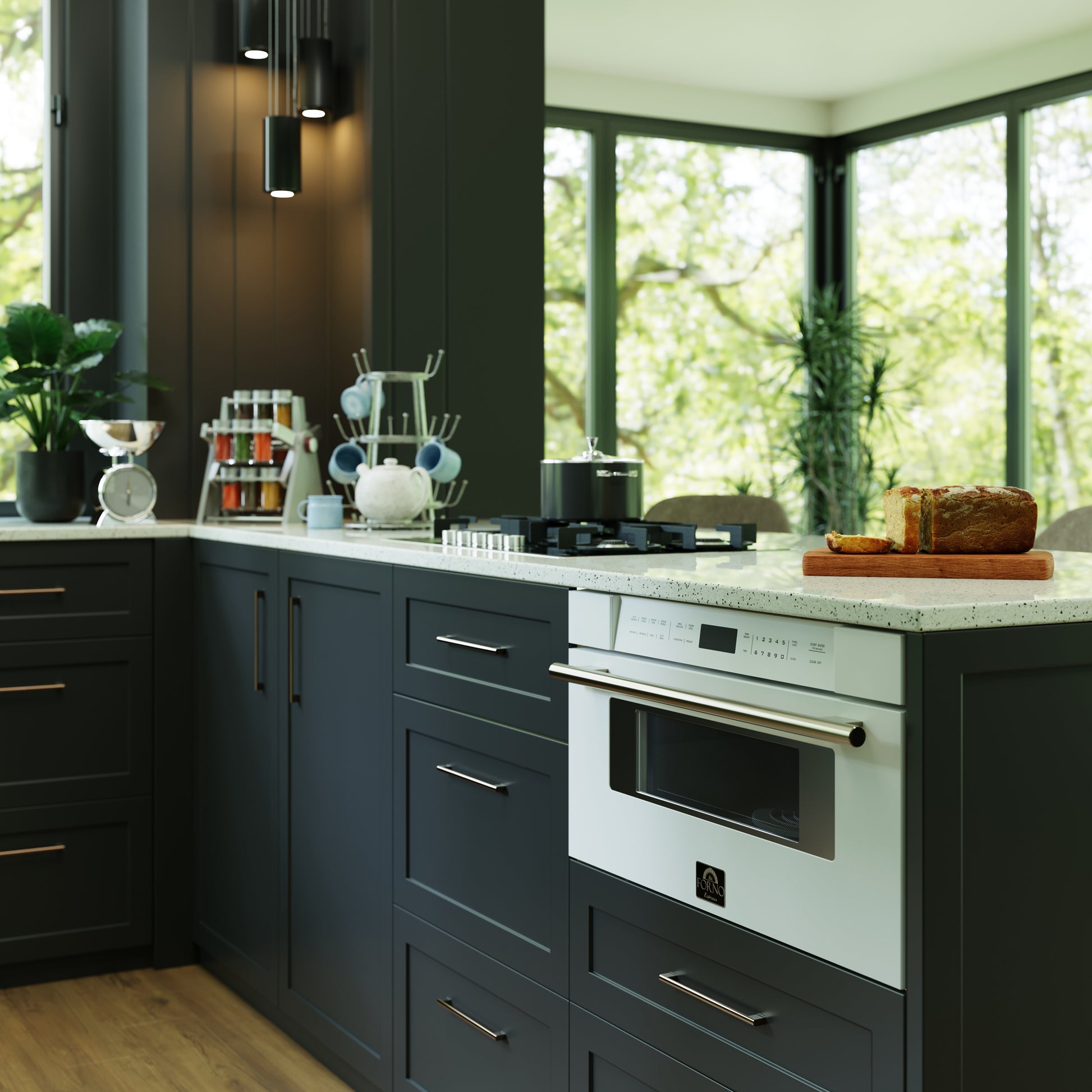Upgrade your kitchen with the Forno Capolivera 30" Microwave Drawer, designed for effortless cooking. Featuring a 1.2 cu. ft. capacity, this white microwave with antique brass accents delivers 1,500 watts of power for fast, even heating—boiling water in just 1 minute and 50 seconds. With 11 power levels, you can precisely control cooking temperatures for everything from reheating to gourmet prep. Glass touch controls and an LED display offer a modern, user-friendly experience, while pre-programmed settings make it easy to melt butter, chocolate, and more. Enjoy versatile cooking modes, including defrost, popcorn, and beverage heating. The spacious interior accommodates 7-inch coffee mugs and 16 x 16-inch dishes, making it perfect for everyday use.