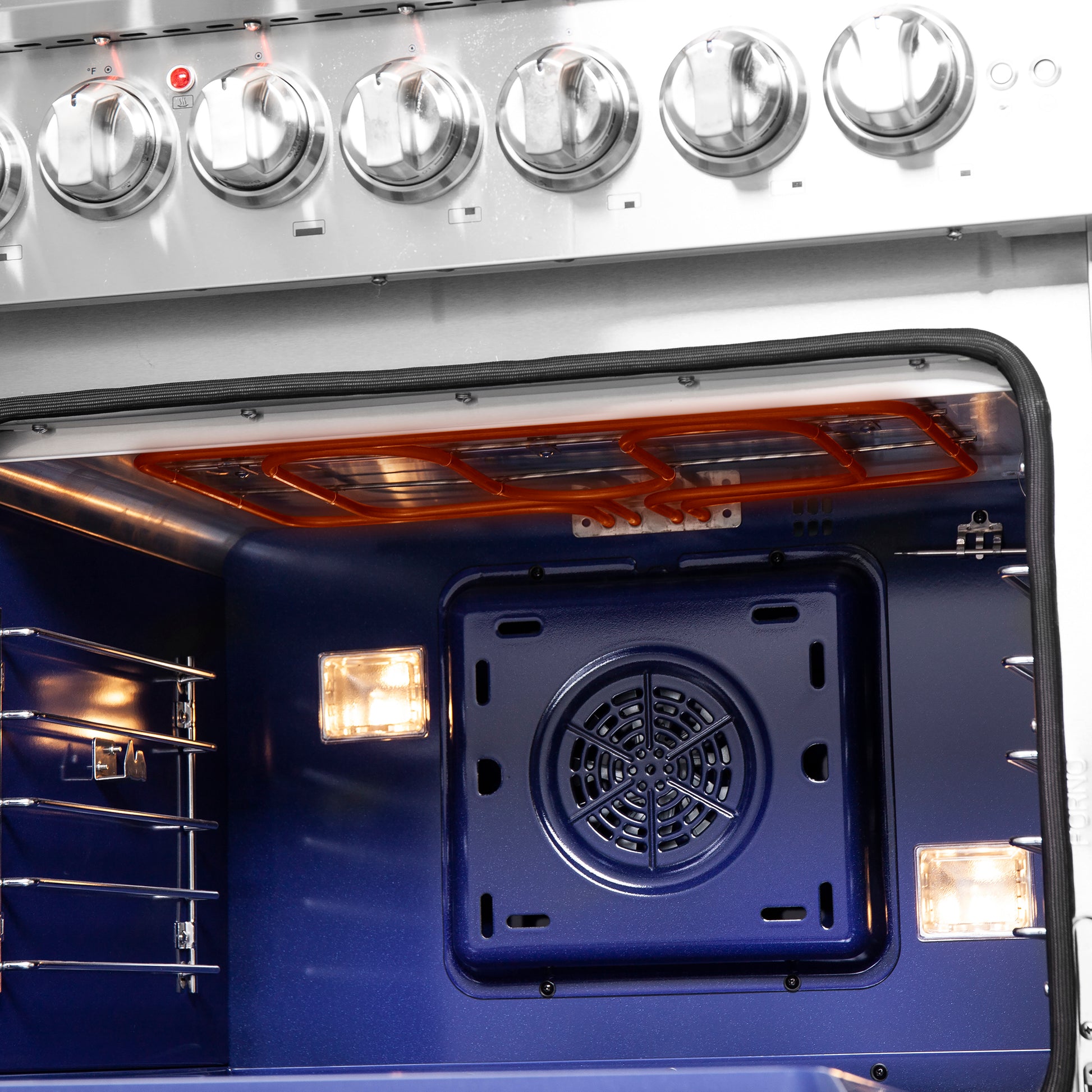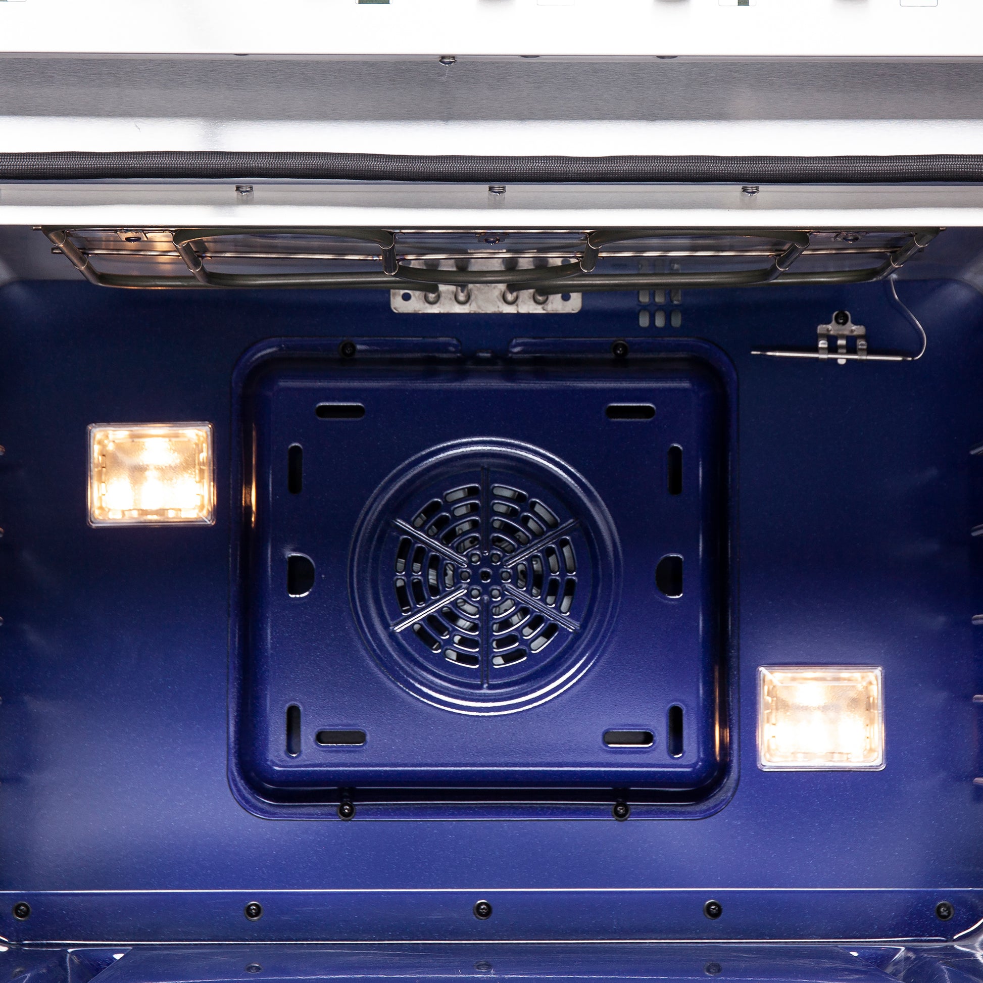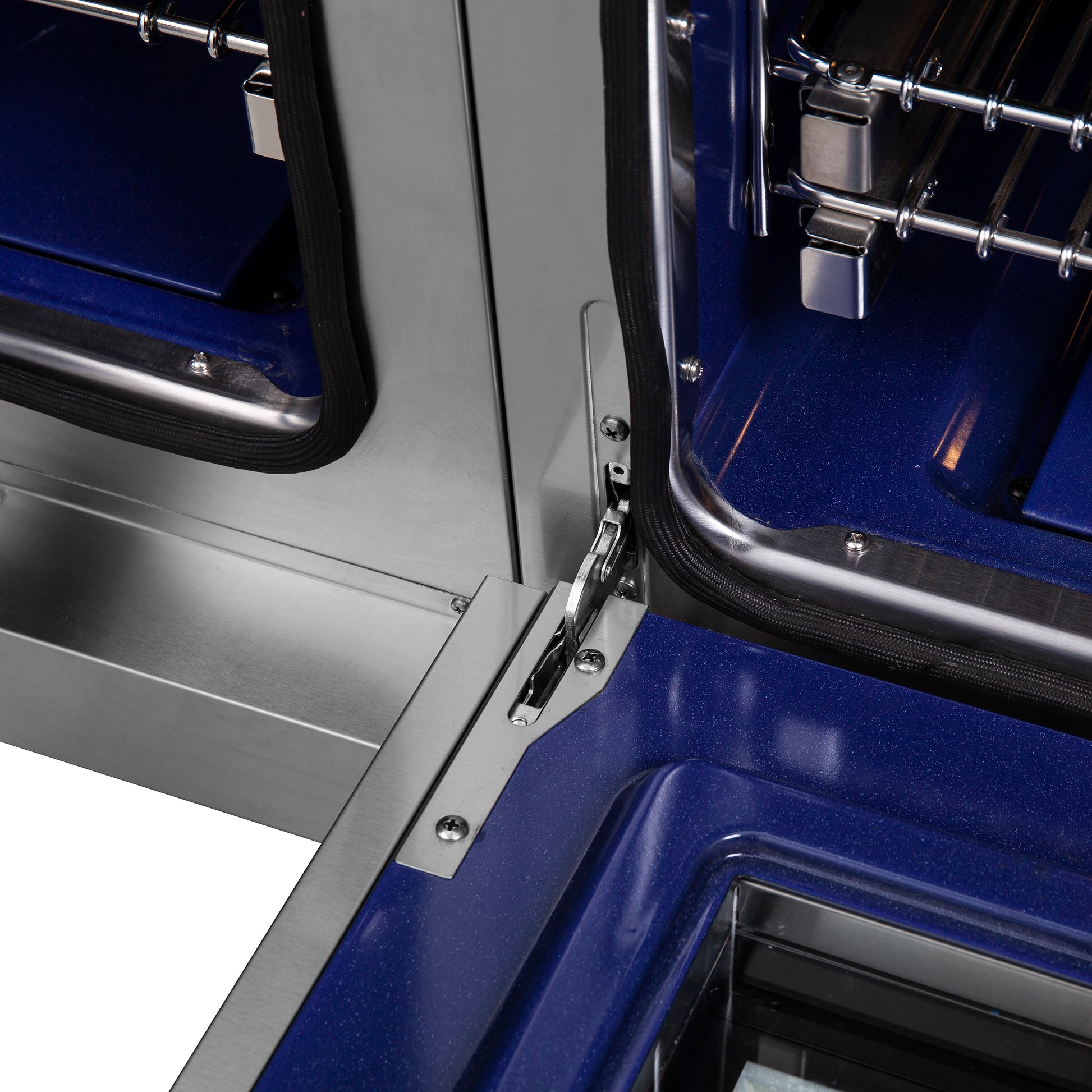 Introducing the Forno Capriasca 48-Inch French Door Dual Fuel Range, which seamlessly blends professional styling and performance into your home kitchen with its durable stainless-steel design. The gas rangetop features eight sealed dual-ring brass burners with a total output of 160,000 BTU, perfect for everything from simmering sauces to melting chocolate. Its heavy-duty continuous cast iron grates provide maximum stability and mobility over a recessed enamel cooking surface, making spills easy to manage and clean. The double electric ovens offer a combined capacity of 6.58 cu.ft. and a total output of 9,700 Watts, enclosed in speckled blue enamel interiors with tempered three-layer glass oven door windows. The right-side oven includes a true convection fan function. Accessories include an LP conversion kit, six stainless steel telescopic oven racks, a wok ring, a reversible grill/griddle, a rotisserie kit with skewers and forks, and an air fry basket with a rack and drip pan. Additionally, zinc-coated metal knobs with bezel rings maintain their aesthetic appeal for years.