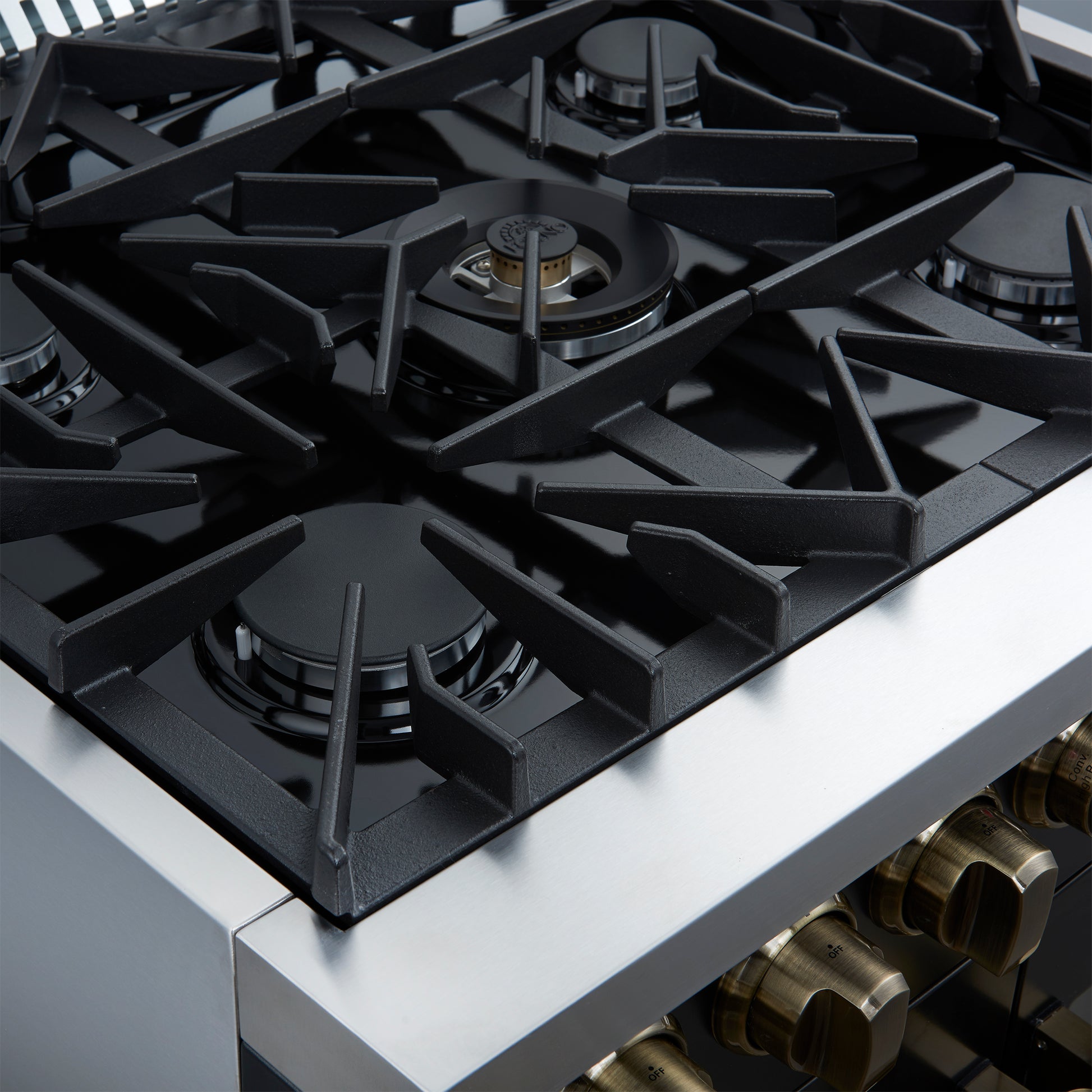 Our 30" Galiano Dual Fuel French Door Range blends timeless design and high performance. Featuring a sleek black finish and antique brass knobs, this range adds sophistication to any kitchen at an affordable price. The cooktop boasts five sealed burners with a total output of 68,000 BTU, including a 20,000 BTU dual-ring burner ideal for boiling, searing, or simmering delicate sauces. The heavy-duty cast iron grates provide a stable surface and allow you to slide cookware effortlessly across the cooktop. Its spacious 4.32 cu.ft. true convection oven delivers even heat distribution, powered by 6,300 watts, for perfectly baked and roasted dishes. Easy-to-clean black enamel interiors, French door convenience, and included electroplated racks make this range as practical as it is beautiful. Complete with an LP conversion kit and NEMA 14-50 power cord, the Galiano Range is built for both style and efficiency.