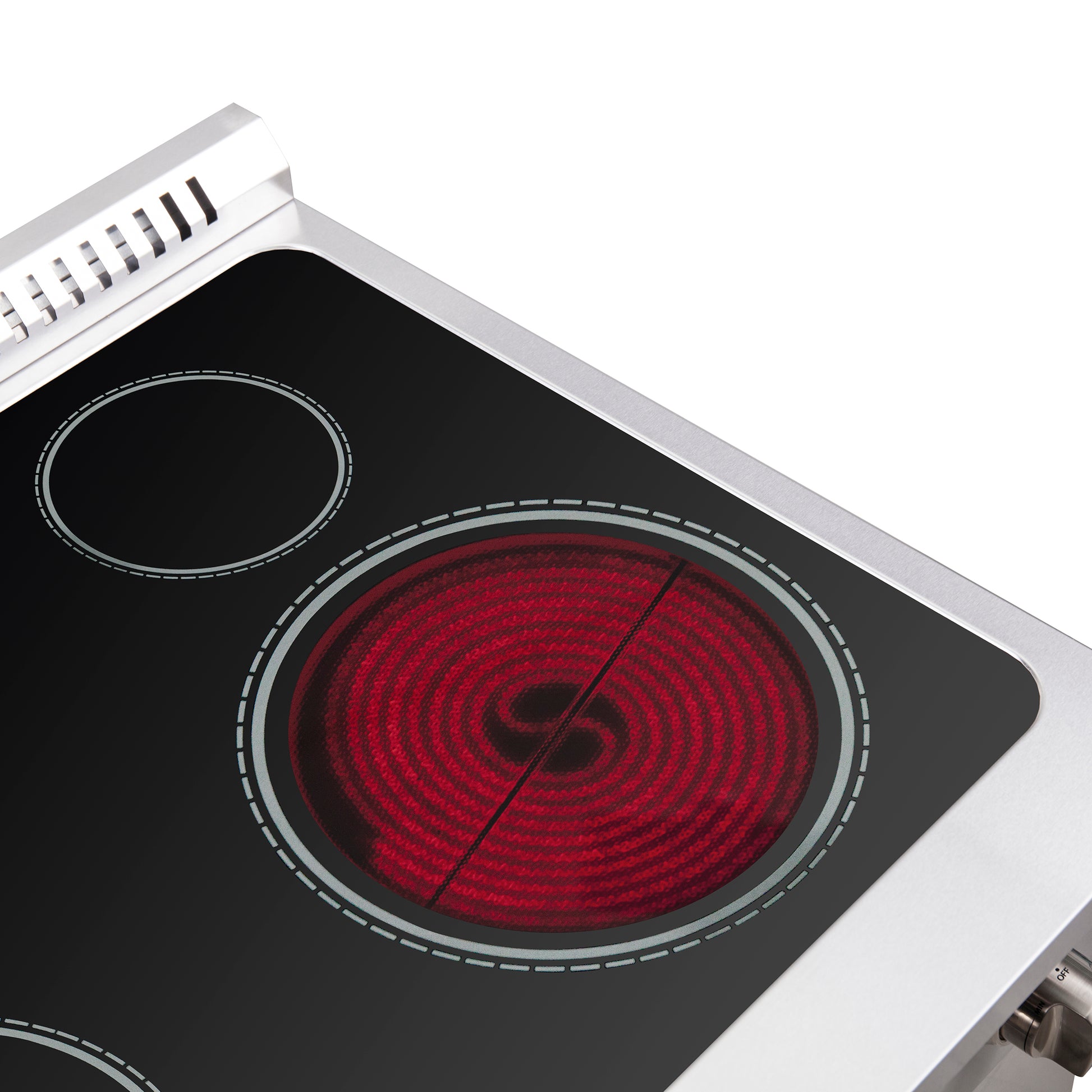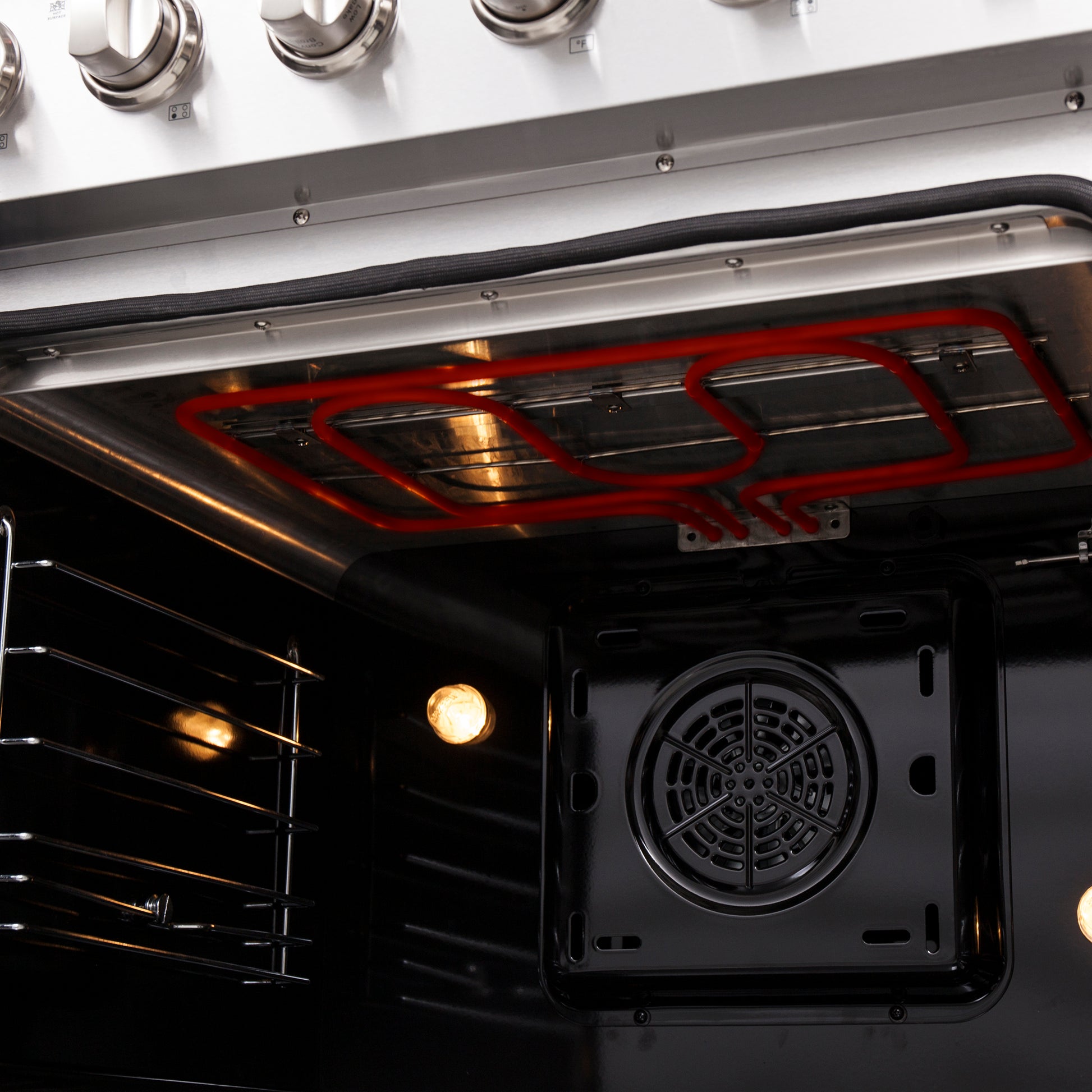 The Forno Galiano 30 Inch French Door Alta Qualita Pro-Style Freestanding Electric Range elevates your home kitchen with professional styling and enduring quality, featuring a robust stainless-steel design. The french door design will make your everyday cooking task easier allowing up to 12 Inch opening for an easy access of your oven. Boasting 4 radiant elements, the cooking surface delivers a total output of 6,500 watts. The 4.32 cu. ft. capacity true convection oven enhances cooking flexibility with a combined broil and bake output of 4,800 watts, complemented by a 1,500 watts true convection fan for precision. This unit includes 2 electroplated oven racks, an Air Fryer kit, and a 4-prong power cord (NEMA 14-50P), providing both versatility and convenience.