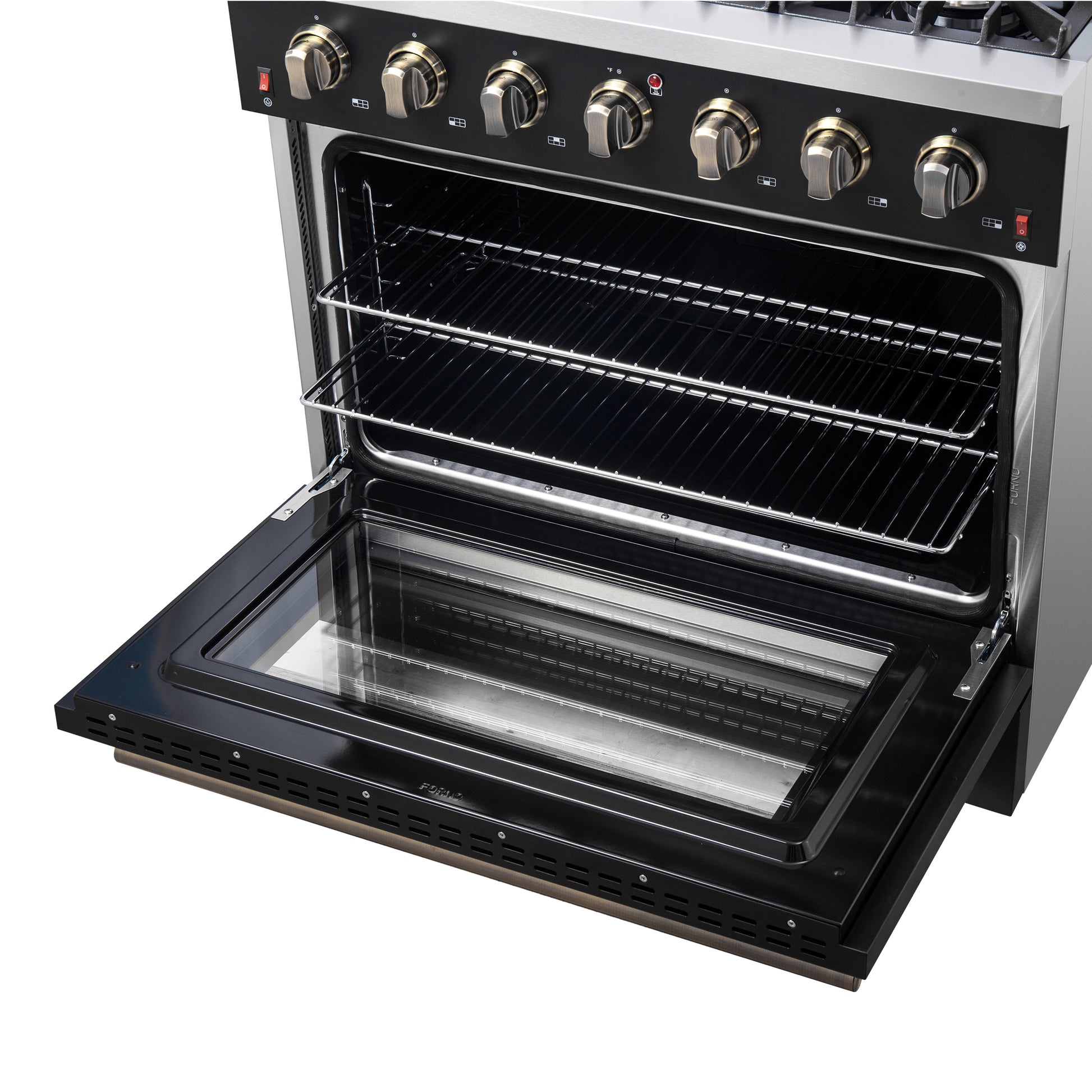 The Forno Galiano 36" Gas Range in sleek black with antique brass accessories combines professional-grade performance with durability. The cooktop features 6 sealed burners with a total output of 83,000 BTU, including a 20,000 BTU dual-ring burner that can simmer at 1,000 BTU. Our cast iron grates ensure cookware stability and effortless movement between burners. The spacious 5.26 cu. ft. convection oven delivers a total of 30,000 BTU for broiling and baking, featuring a sleek black enamel interior and a three-layer tempered glass door for superior heat retention and clear visibility. Additional features include two oven racks, an LP conversion kit, and durable zinc-coated knobs with bezel rings, built to maintain their beauty. Backed by Forno's 2-year warranty, this range offers peace of mind, lasting performance, and exceptional affordability.