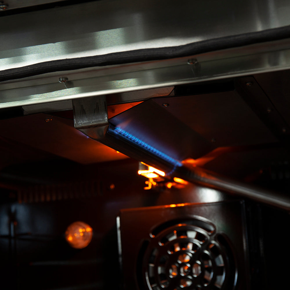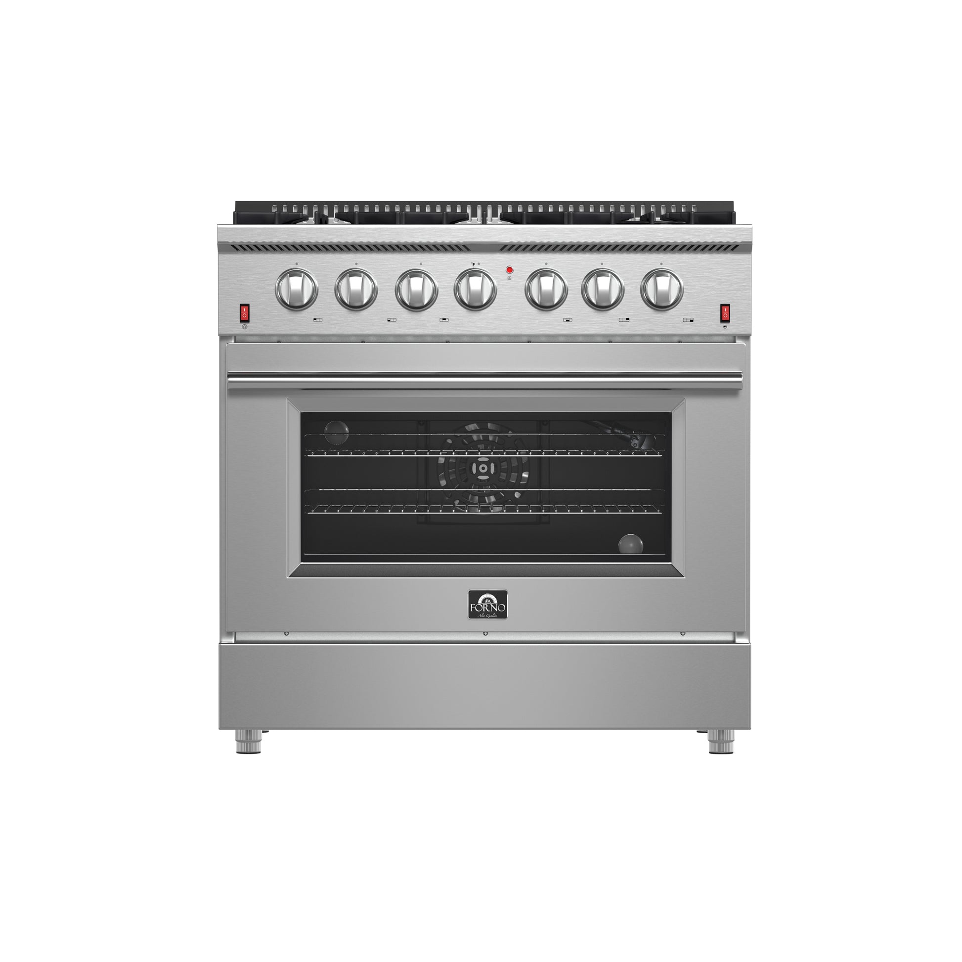 The Forno Galiano 36" Gas Range combines professional-grade performance with sleek stainless steel durability. The cooktop features 6 sealed burners with a total output of 83,000 BTU, including a 20,000 BTU dual-ring burner that can simmer at 1,000 BTU. Our cast iron grates ensure cookware stability and effortless movement between burners. The spacious 5.26 cu. ft. convection oven delivers a total of 30,000 BTU for broiling and baking, featuring a sleek black enamel interior and a three-layer tempered glass door for superior heat retention and clear visibility. Additional features include two oven racks, an LP conversion kit, and durable zinc-coated knobs with bezel rings, built to maintain their beauty. Backed by Forno's 2-year warranty, this range offers peace of mind, lasting performance, and exceptional affordability.