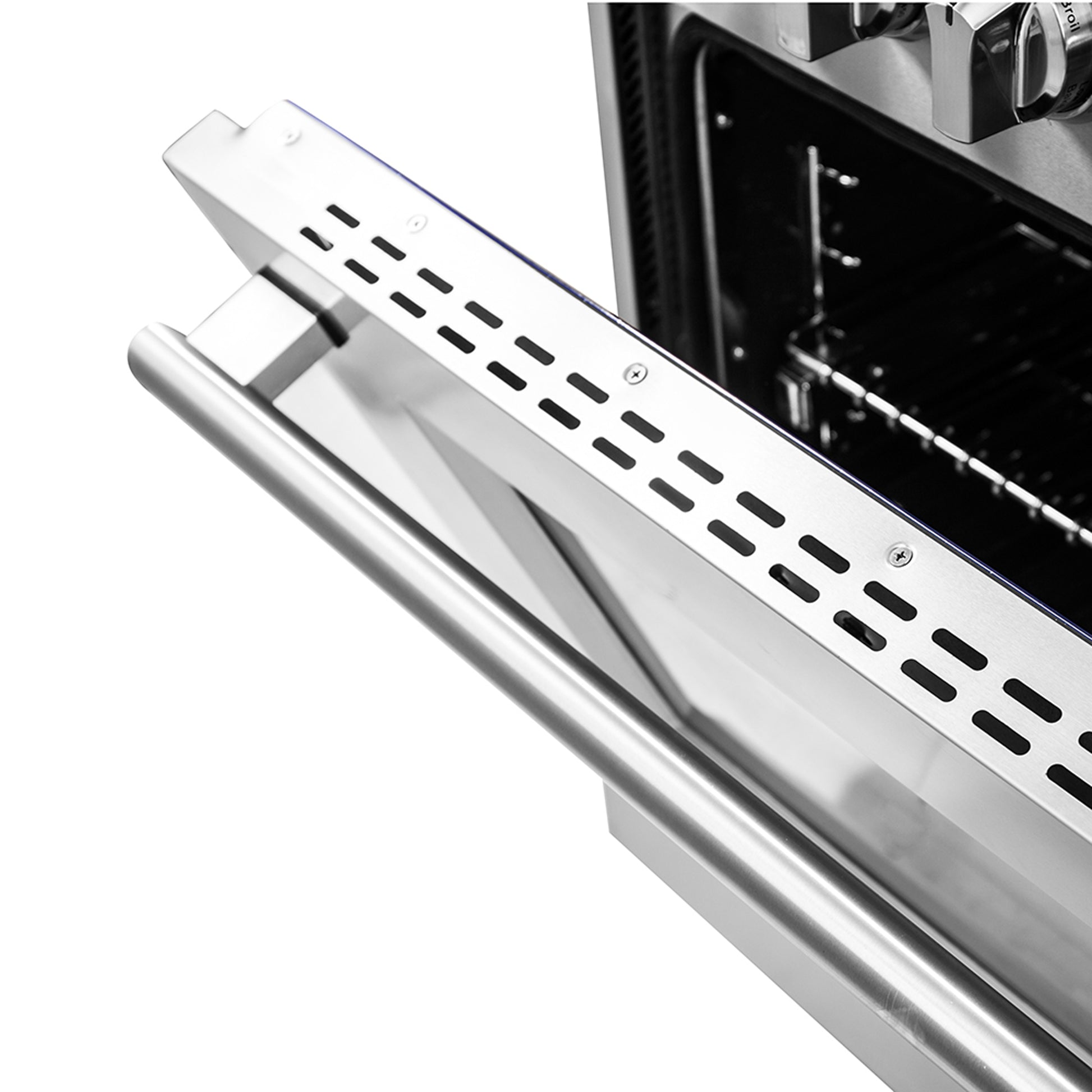 The Massimo 36 Inch Dual Fuel Range delivers professional style and durability to your home kitchen with its robust stainless-steel design. The cooktop features 6 sealed burners, 83,000 BTU output which one is a 20,000 BTU dual-ring burner that can reach a simmer of 1,000 BTU for precise simmering. Continuous cast iron grates ensure stability over the enamel cooktop cavity, containing spills for easy cleaning. The 5.36 cu.ft. true convection fan oven boasts a blue enamel interior, making cleaning a breeze. The 3-layer glass oven door window retains heat and provides a clear view. With a powerful 6,300 Watts output, this oven excels in baking, roasting, and broiling. Included are 2 telescopic oven racks, wok support, griddle, air-fryer kit with drip pan, a NEMA 14-50P power cord and an LP conversion kit. Housed in a high-grade stainless steel body with illuminated zinc knobs, the Massimo offers a stylish, long-lasting addition to your kitchen.