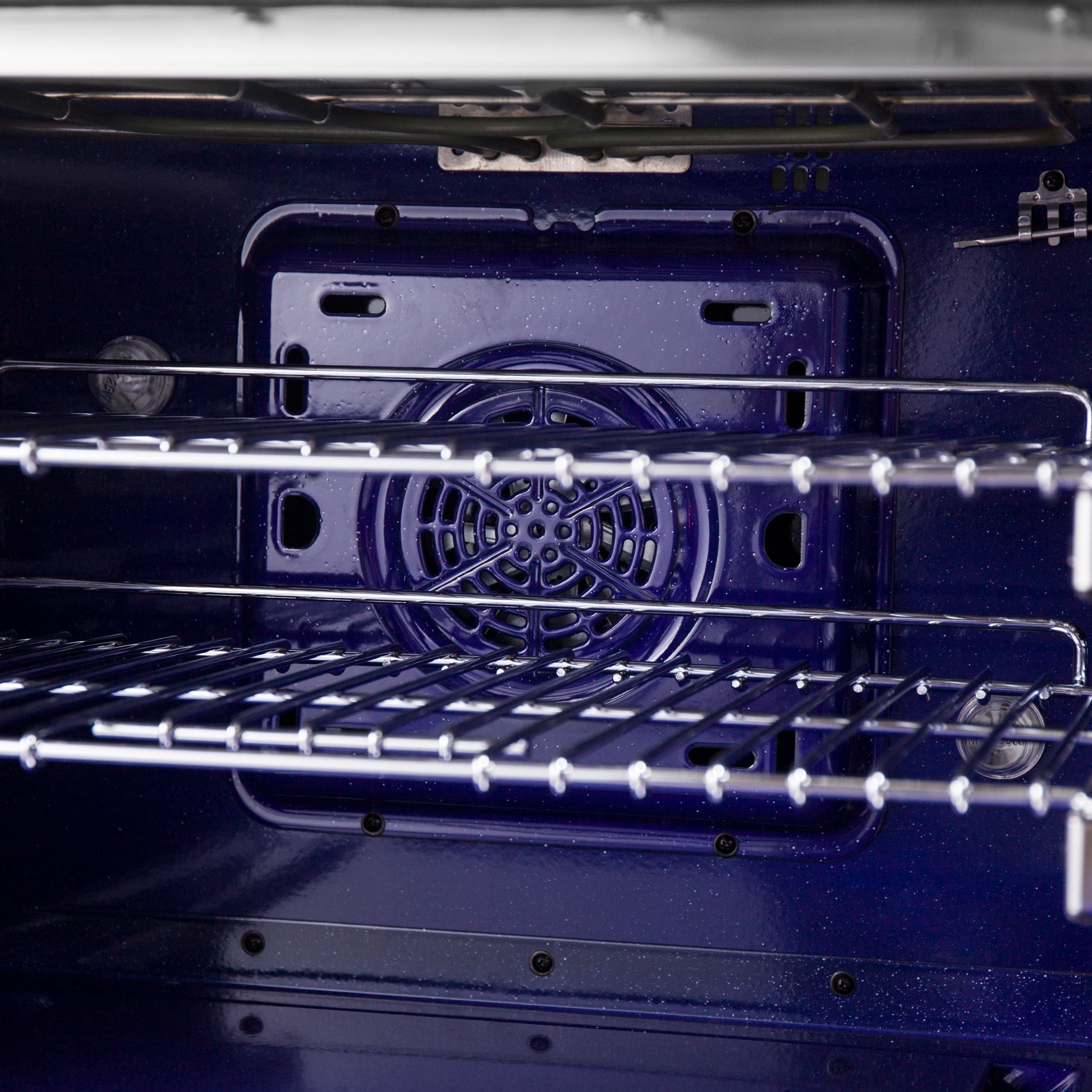The Forno Massimo 60 Inch dual fuel range harmonizes professional style and 304-grade stainless steel durability. Its 10 sealed burners, totaling 142,000 BTU, include two precision 20,000 BTU dual-ring burner that can simmer at 1,000 BTU. Continuous cast iron grates ensure stability on the enamel surface, allowing you to effortlessly move pots and pans on and off heat. Equipped with two true convection ovens boasting a combined 8.64 cu.ft. capacity and a total output of 12,600 Watts, this range offers ample power for baking, roasting, and broiling. The interiors are adorned with impressive blue enamel, ensuring easy cleaning, while the 3-layer glass oven door window provides optimal heat retention and a clear view. Included with the range are 4 fully telescopic easy-access stainless steel oven racks, 2 reversible griddles, an air fryer basket with a drip pan, a wok support, an LP conversion kit and a NEMA 14-50P power cord for an easy installation. Not to mention, the zinc-coated metal knobs with bezel rings are designed to maintain their beauty for years to come, adding a touch of sophistication to your kitchen space.