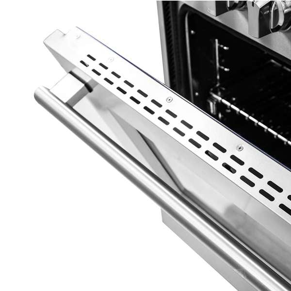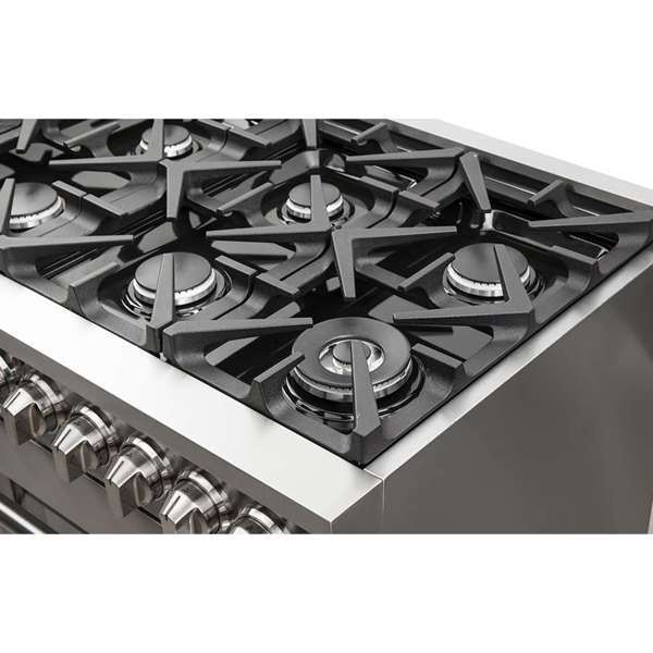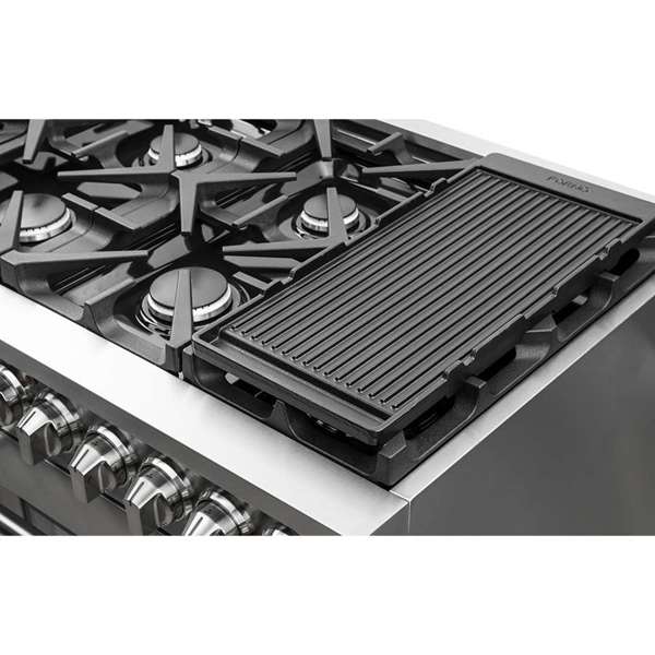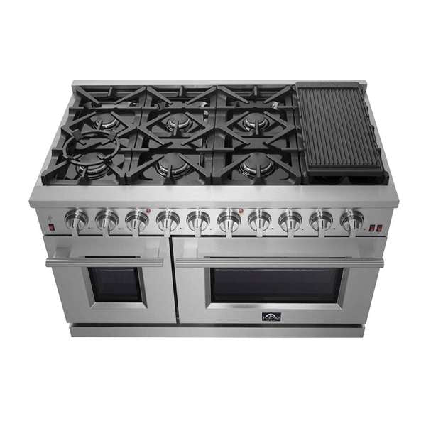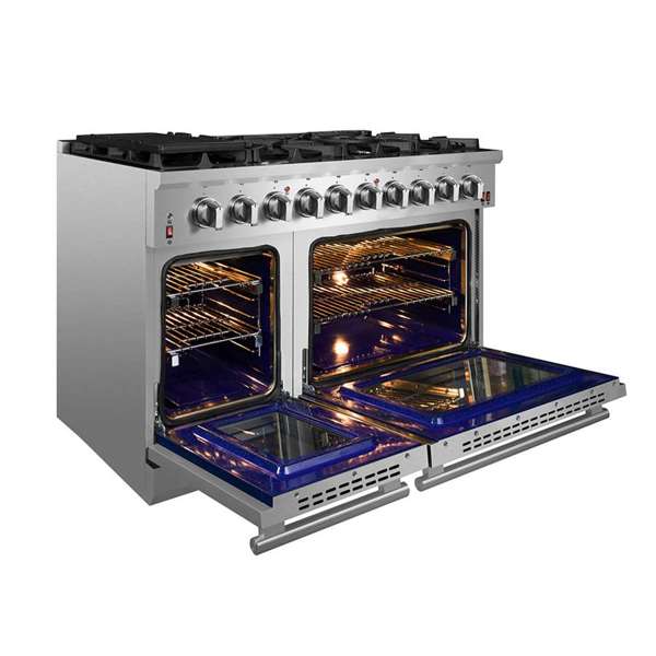 The Forno Massimo 48 Inch Gas Range harmonizes professional style and 304-grade stainless steel durability. Its 8 sealed burners, totaling 107,000 BTU, include a precision 20,000 BTU dual-ring burner that can simmer at 1,000 BTU. Continuous cast iron grates ensure stability on the enamel surface. The main oven of 4.32 Cu.Ft has a convection fan with 30,000 BTU Total Broil and Bake output. The secondary oven has a capacity of 2.26 Cu.Ft. with a 14,000 BTU Bake output. Both ovens have an impressive blue enamel interiors allowing for easy cleaning and 3-layer glass oven door window provides both heat retention and an unobstructed view. It features 2 telescopic racks per oven, an air fryer kit, a wok support, two reversible griddle, an LP conversion kit, and durable zinc-coated metal knobs. Elevate your kitchen with performance, convenience, and enduring elegance.